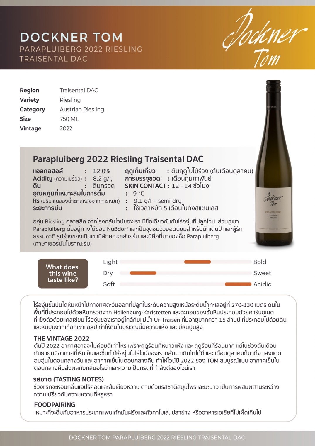 องุ่น Riesling คลาสสิค จากโรงกลั่นไวน์ของเรา มีชื่อเดียวกันกับไร่องุ่นที่ปลูกไวน์ ส่วนภูเขา Parapluiberg ตั้งอยู่ทางใต้ของ Nußdorf และเป็นจุดชมวิวยอดนิยมสำหรับนักเดินป่าและผู้รักธรรมชาติ รูปร่างของเนินเขามีลักษณะคล้ายร่ม และนี่คือที่มาของชื่อ Parapluiberg (ภาษาเยอรมันโบราณ:ร่ม)
