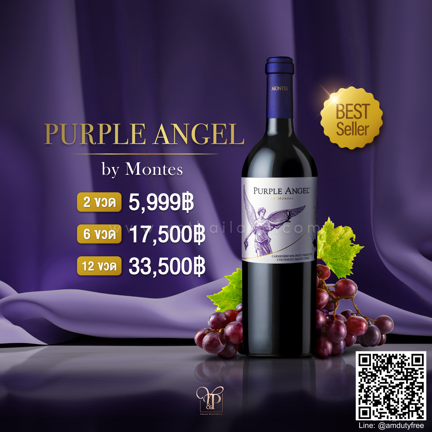 Montes Purple Angel Carmenere เป็นไวน์ที่ได้รับการยกย่องอย่างสูงในหมู่ผู้ชื่นชอบไวน์แดง ผลิตจากองุ่น Carmenere และ Petit Verdot คุณภาพสูงจากแคว้น Colchagua Valley ซึ่งไวน์นี้ถือเป็นหนึ่งในไวน์ที่ดีที่สุดจากภูมิภาคนี้ ด้วยความเข้มข้นและโครงสร้างที่หรูหรา Montes Purple Angel นำเสนอรสชาติที่ซับซ้อนและกลมกล่อม ซึ่งแสดงถึงเอกลักษณ์ของไวน์ Carmenere ได้อย่างเต็มที่