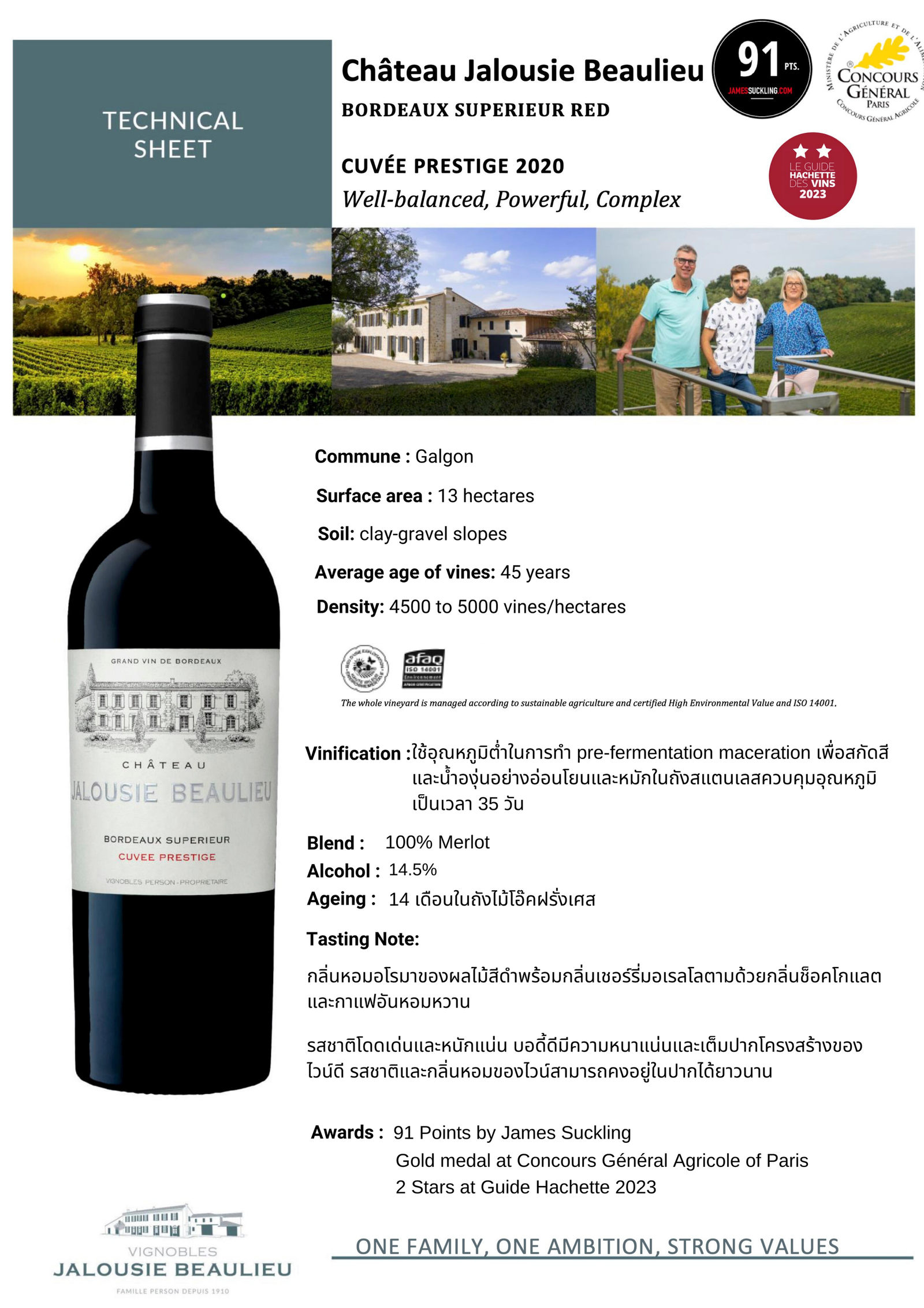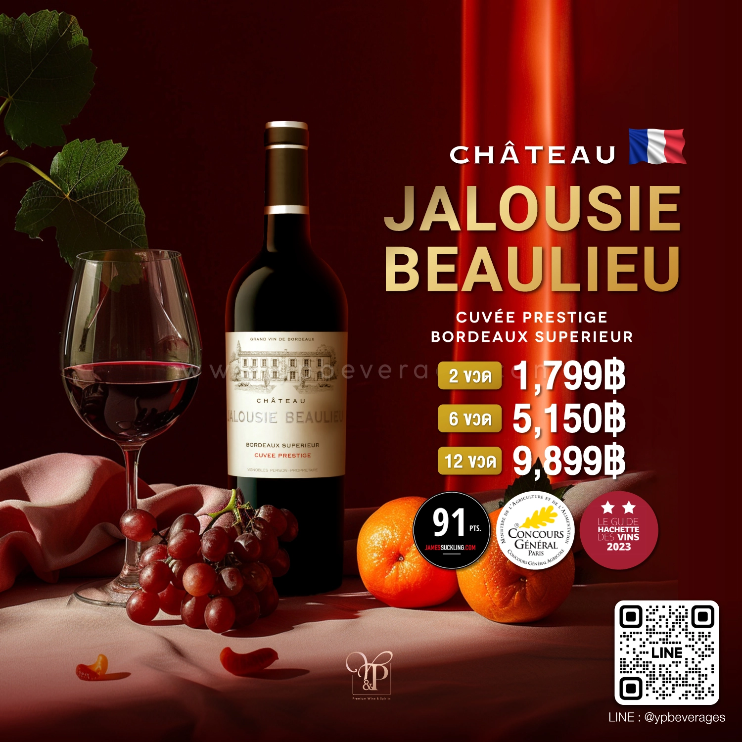 CHATEAU JALOUSIE BEAULIEU CUVEE PRESTIGE ปี 2020 คือไวน์ชาโตจากเมืองบอร์กโดซ์,ประเทศฝรั่งเศส หนึ่งใน BORDEAUX SUPERIEUR บ่มในถังไม้โอ๊กฝรั่งเศสเป็นเวลา 12 เดือน ขึ้นไป