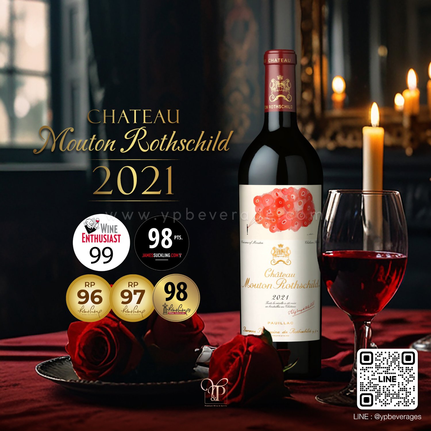 CHATEAU MOUTON ROTHSCHILD ปี 2021 ไวน์แดงสีม่วงเข้มมันวาว กลิ่นหอมเข้มข้นและสง่างามของกลิ่นแบล็กเบอร์รี่และแบล็กเคอร์แรนท์ที่มีกลิ่นหอมเย้ายวน ผสมผสานกับโน้ตดอกไอริสและสัมผัสของเครื่องเทศและไม้ซีดาร์ รสชาติสมดุล,สดชื่นและกลมกลืน มีกลิ่นช็อกโกแลต รสชาติเต็มปากเต็มคำด้วยแทนนินที่นุ่มนวลและละเอียดอ่อน จบยาวนานและติดทนปลดปล่อยโน้ตของผลไม้สดที่มีรสเผ็ดออกมาอย่างต่อเนื่อง