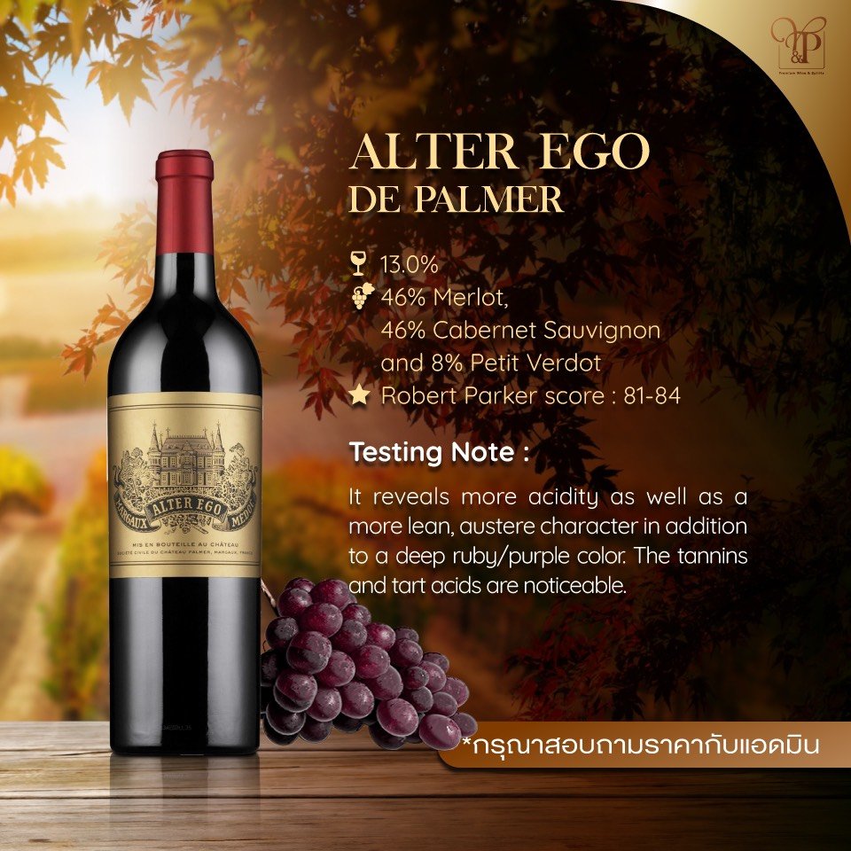 CHATEAU PALMER ALTER EGO DE PALMER 2021 เป็นไวน์ฉลาก2จาก CHATEAU PALMER ซึ่งเป็นหนึ่งในโรงบ่มไวน์ที่มีชื่อเสียงที่สุดในเขต MARGAUX ของ BORDEAUX การผสมผสานระหว่าง MERLOT, CABERNET SAUVIGNON, และ PETIT VERDOT ทำให้ไวน์นี้มีความสมดุลและความซับซ้อนที่ยอดเยี่ยม โดย MERLOT ให้ความนุ่มนวลและความกลมกล่อม ขณะที่ CABERNET SAUVIGNON เพิ่มโครงสร้างและแทนนินที่แข็งแรง ส่วน PETIT VERDOT ช่วยเสริมกลิ่นและรสชาติที่ล้ำลึก