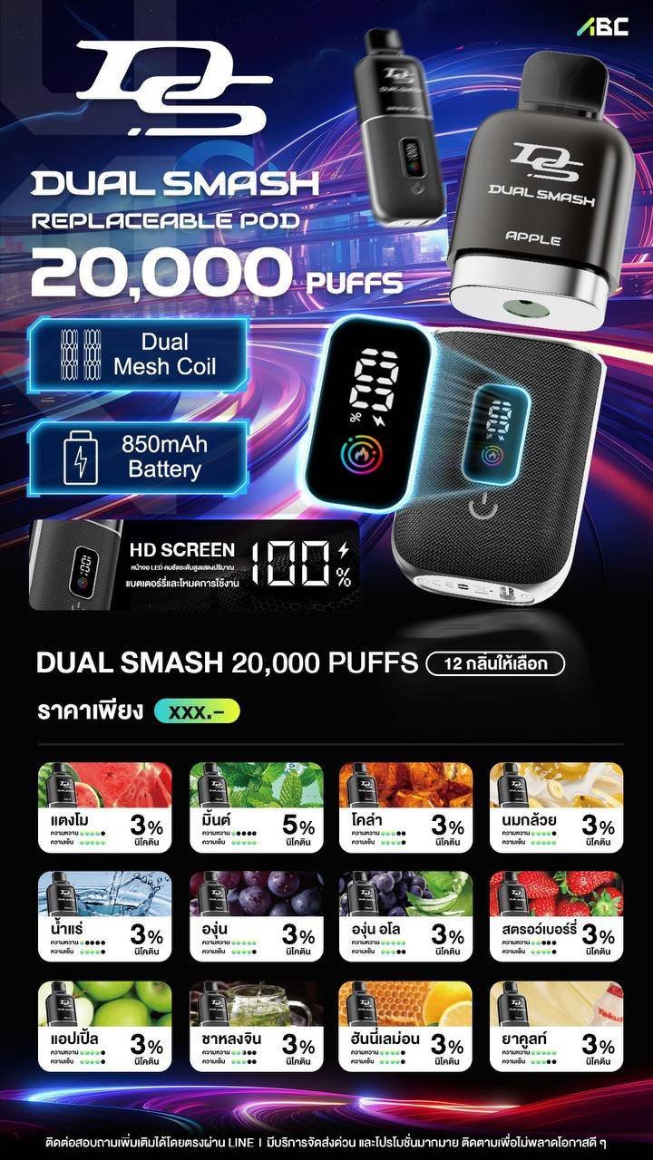 DUAL SMASH 20000 PUFFS คือพอตใช้แล้วทิ้งที่รวมทุกความสะดวกไว้ในเครื่องเดียว สำหรับสายสูบที่ต้องการทั้งความแรง ความชัด และความคุ้มค่า จุดเด่นอยู่ที่ “สามารถถอดเปลี่ยนหัวน้ำยาได้” — อยากเปลี่ยนกลิ่นก็เพียงแค่เปลี่ยนหัว ไม่ต้องพกหลายเครื่องหรือเติมน้ำยาให้ยุ่งยากเหมือนรุ่นเก่าอีกต่อไป